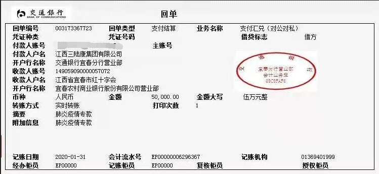 1月31日,江西三陸康集團第一時間向宜春市紅十字會捐款伍萬元,彰顯企業擔當,助力疫情防控。