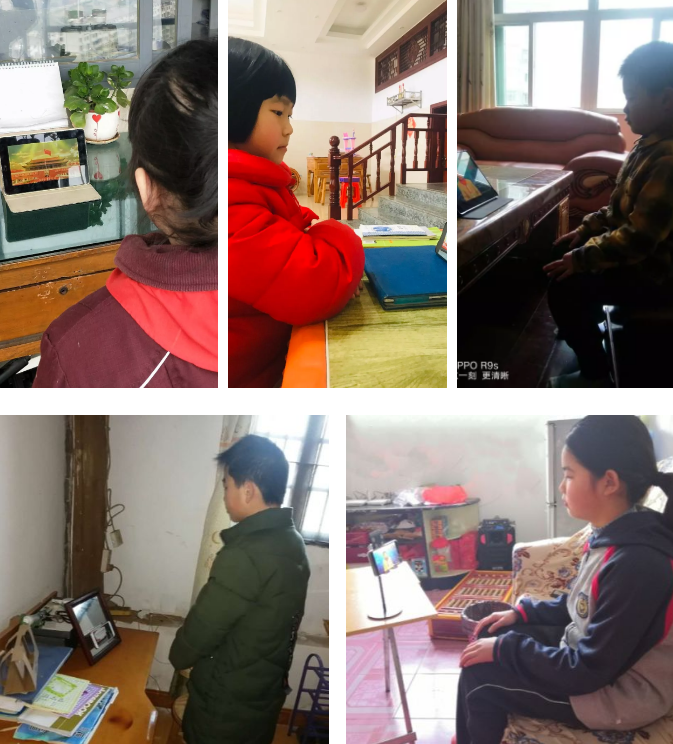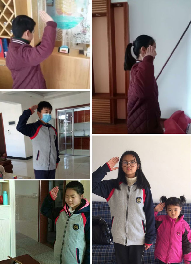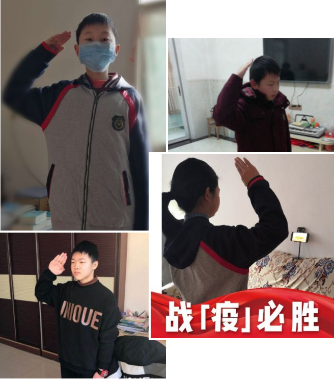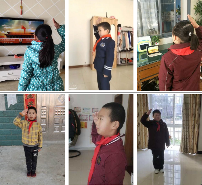 看著一個(gè)個(gè)穿戴整齊的同學(xué)們,他們胸前佩戴紅領(lǐng)巾在家面向直播中的國旗肅立,聽指揮高唱國歌,少先隊(duì)員敬隊(duì)禮。相信因?yàn)橐咔殚_學(xué)遇到了延遲,但是我們對祖國的愛從不延遲!